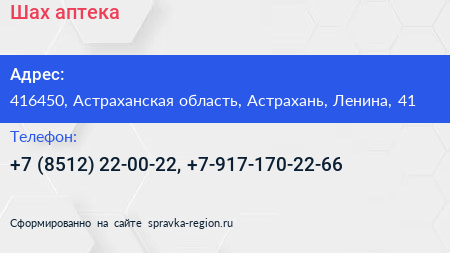 Шах, аптека по адресу 416450, Астраханская область, Астрахань, Ленина, 41 в дальнейшем Организация, размещена в следующих категориях: