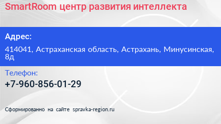 SmartRoom, центр развития интеллекта по адресу 414041, Астраханская область, Астрахань, Минусинская, 8д в дальнейшем Организация, размещена в следующих категориях: