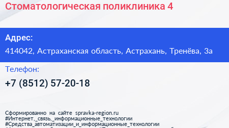 Стоматологическая поликлиника №4 по адресу 414042, Астраханская область, Астрахань, Тренёва, 3а в дальнейшем Организация, размещена в следующих категориях: