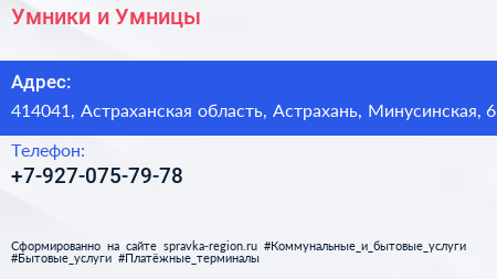 Умники и Умницы по адресу 414041, Астраханская область, Астрахань, Минусинская, 6 в дальнейшем Организация, размещена в следующих категориях: