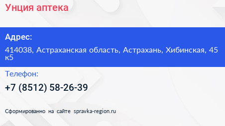 Унция, аптека по адресу 414038, Астраханская область, Астрахань, Хибинская, 45 к5 в дальнейшем Организация, размещена в следующих категориях: