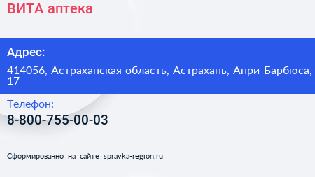 ВИТА, аптека по адресу 414056, Астраханская область, Астрахань, Анри Барбюса, 17 в дальнейшем Организация, размещена в следующих категориях: