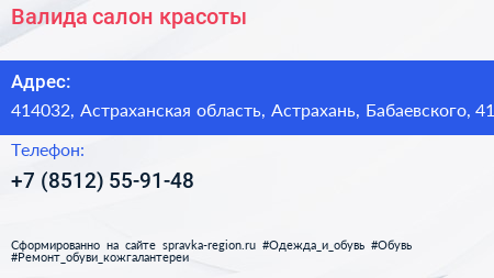 Валида, салон красоты по адресу 414032, Астраханская область, Астрахань, Бабаевского, 41 в дальнейшем Организация, размещена в следующих категориях: