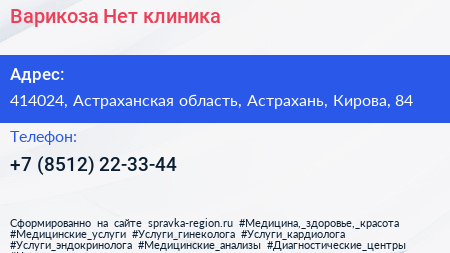 Варикоза Нет, клиника по адресу 414024, Астраханская область, Астрахань, Кирова, 84 в дальнейшем Организация, размещена в следующих категориях: