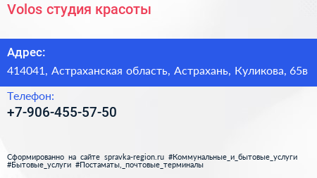 Volos, студия красоты по адресу 414041, Астраханская область, Астрахань, Куликова, 65в в дальнейшем Организация, размещена в следующих категориях: