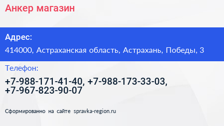 Анкер, магазин по адресу 414000, Астраханская область, Астрахань, Победы, 3 в дальнейшем Организация, размещена в следующих категориях: