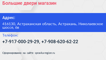 Большие двери, магазин по адресу 416130, Астраханская область, Астрахань, Николаевское шоссе, 6в в дальнейшем Организация, размещена в следующих категориях: