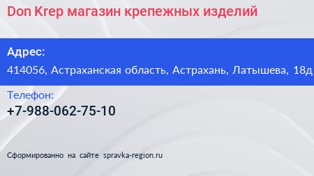 Don-Krep, магазин крепежных изделий по адресу 414056, Астраханская область, Астрахань, Латышева, 18д в дальнейшем Организация, размещена в следующих категориях: