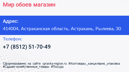 Мир обоев, магазин по адресу 414004, Астраханская область, Астрахань, Рылеева, 30 в дальнейшем Организация, размещена в следующих категориях: