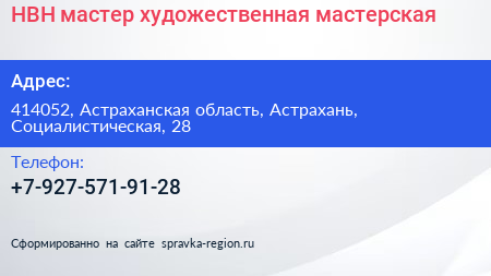 НВН-мастер, художественная мастерская по адресу 414052, Астраханская область, Астрахань, Социалистическая, 28 в дальнейшем Организация, размещена в следующих категориях: