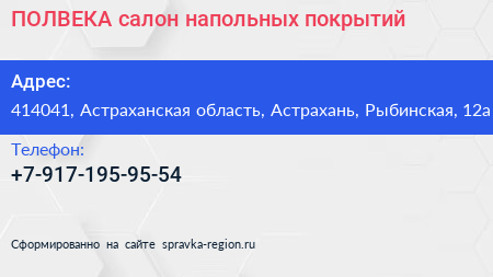 ПОЛВЕКА, салон напольных покрытий по адресу 414041, Астраханская область, Астрахань, Рыбинская, 12а в дальнейшем Организация, размещена в следующих категориях:
