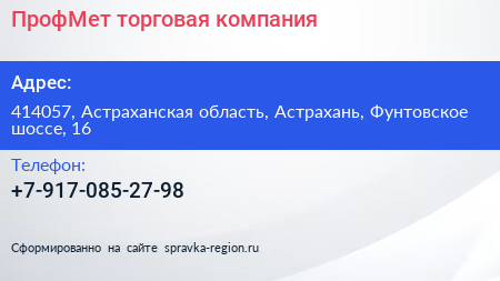 ПрофМет, торговая компания по адресу 414057, Астраханская область, Астрахань, Фунтовское шоссе, 16 в дальнейшем Организация, размещена в следующих категориях: