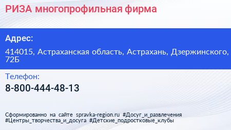 РИЗА, многопрофильная фирма по адресу 414015, Астраханская область, Астрахань, Дзержинского, 72Б в дальнейшем Организация, размещена в следующих категориях: