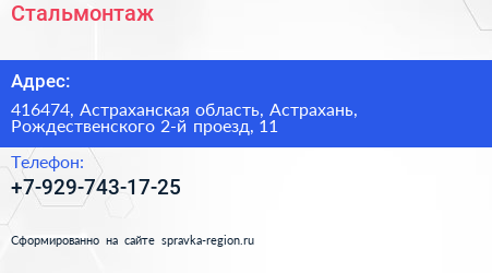 Стальмонтаж по адресу 416474, Астраханская область, Астрахань, Рождественского 2-й проезд, 11 в дальнейшем Организация, размещена в следующих категориях: