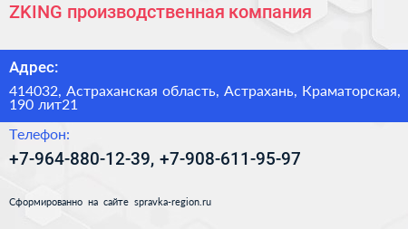 ZKING, производственная компания по адресу 414032, Астраханская область, Астрахань, Краматорская, 190 лит21 в дальнейшем Организация, размещена в следующих категориях: