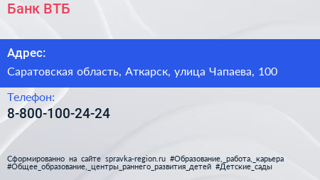 Банк ВТБ по адресу Саратовская область, Аткарск, улица Чапаева, 100 в дальнейшем Организация, размещена в следующих категориях: