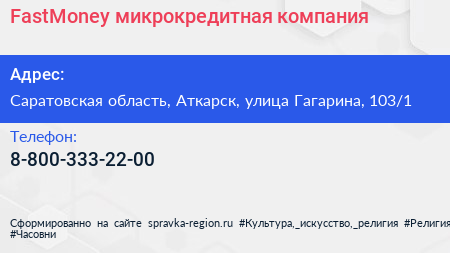 FastMoney, микрокредитная компания по адресу Саратовская область, Аткарск, улица Гагарина, 103/1 в дальнейшем Организация, размещена в следующих категориях: