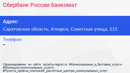 Сбербанк России, банкомат по адресу Саратовская область, Аткарск, Советская улица, 115 в дальнейшем Организация, размещена в следующих категориях: