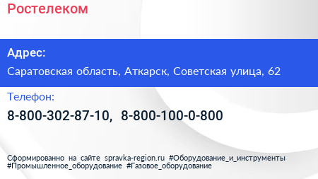 Ростелеком по адресу Саратовская область, Аткарск, Советская улица, 62 в дальнейшем Организация, размещена в следующих категориях: