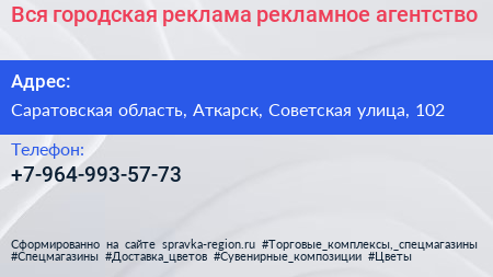 Вся городская реклама, рекламное агентство по адресу Саратовская область, Аткарск, Советская улица, 102 в дальнейшем Организация, размещена в следующих категориях: