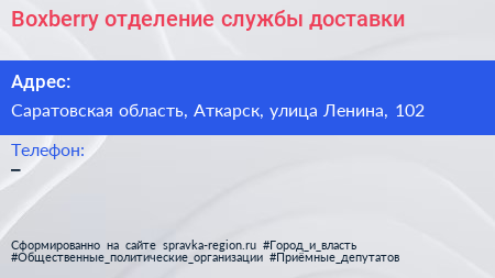 Boxberry, отделение службы доставки по адресу Саратовская область, Аткарск, улица Ленина, 102 в дальнейшем Организация, размещена в следующих категориях: