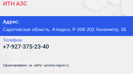 ИТН, АЗС по адресу Саратовская область, Аткарск, Р-208 202 Километр, 1Б в дальнейшем Организация, размещена в следующих категориях: