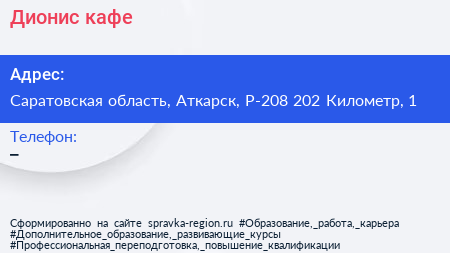 Дионис, кафе по адресу Саратовская область, Аткарск, Р-208 202 Километр, 1 в дальнейшем Организация, размещена в следующих категориях: