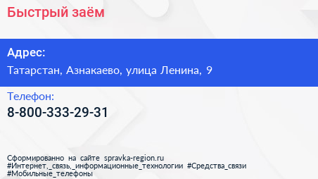Быстрый заём по адресу Татарстан, Азнакаево, улица Ленина, 9 в дальнейшем Организация, размещена в следующих категориях: