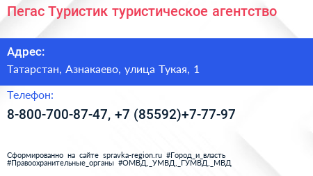 Пегас Туристик, туристическое агентство по адресу Татарстан, Азнакаево, улица Тукая, 1 в дальнейшем Организация, размещена в следующих категориях: