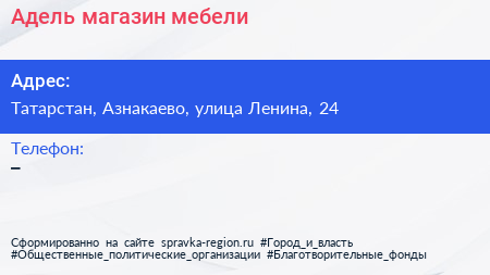 Адель, магазин мебели по адресу Татарстан, Азнакаево, улица Ленина, 24 в дальнейшем Организация, размещена в следующих категориях: