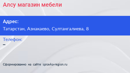 Алсу, магазин мебели по адресу Татарстан, Азнакаево, Султангалиева, 8 в дальнейшем Организация, размещена в следующих категориях: