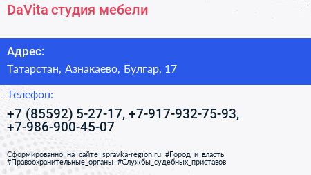 DaVita, студия мебели по адресу Татарстан, Азнакаево, Булгар, 17 в дальнейшем Организация, размещена в следующих категориях: