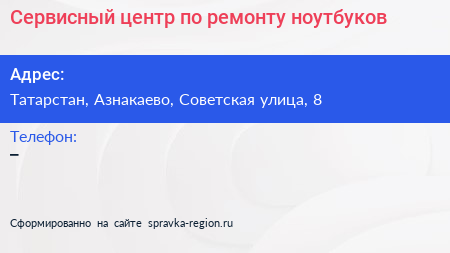 Сервисный центр по ремонту ноутбуков по адресу Татарстан, Азнакаево, Советская улица, 8 в дальнейшем Организация, размещена в следующих категориях: