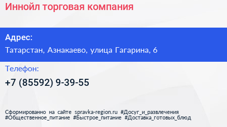 Иннойл, торговая компания по адресу Татарстан, Азнакаево, улица Гагарина, 6 в дальнейшем Организация, размещена в следующих категориях: