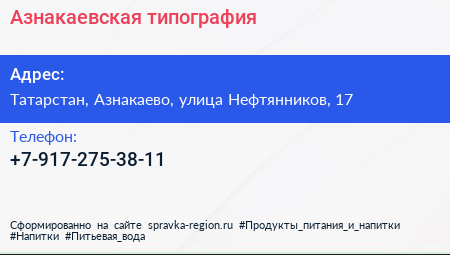Азнакаевская типография по адресу Татарстан, Азнакаево, улица Нефтянников, 17 в дальнейшем Организация, размещена в следующих категориях: