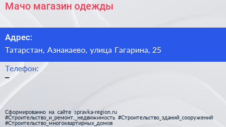 Мачо, магазин одежды по адресу Татарстан, Азнакаево, улица Гагарина, 25 в дальнейшем Организация, размещена в следующих категориях:
