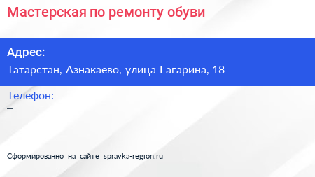 Мастерская по ремонту обуви по адресу Татарстан, Азнакаево, улица Гагарина, 18 в дальнейшем Организация, размещена в следующих категориях: