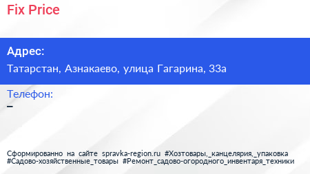 Fix Price по адресу Татарстан, Азнакаево, улица Гагарина, 33а в дальнейшем Организация, размещена в следующих категориях: