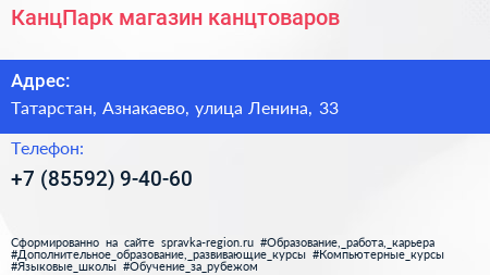 КанцПарк, магазин канцтоваров по адресу Татарстан, Азнакаево, улица Ленина, 33 в дальнейшем Организация, размещена в следующих категориях: