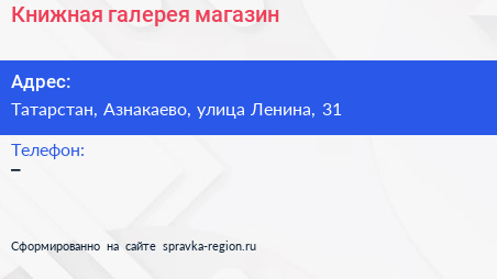 Книжная галерея, магазин по адресу Татарстан, Азнакаево, улица Ленина, 31 в дальнейшем Организация, размещена в следующих категориях: