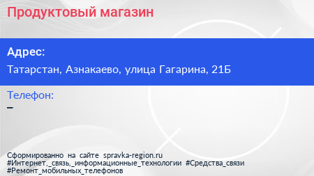 Продуктовый магазин по адресу Татарстан, Азнакаево, улица Гагарина, 21Б в дальнейшем Организация, размещена в следующих категориях: