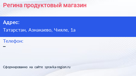 Регина, продуктовый магазин по адресу Татарстан, Азнакаево, Чияле, 1а в дальнейшем Организация, размещена в следующих категориях: