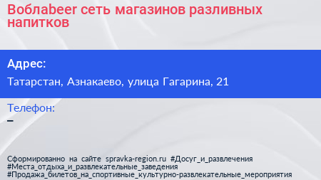 Воблаbeer, сеть магазинов разливных напитков по адресу Татарстан, Азнакаево, улица Гагарина, 21 в дальнейшем Организация, размещена в следующих категориях: