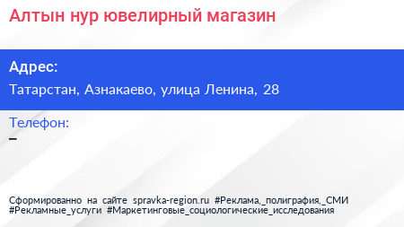 Алтын нур, ювелирный магазин по адресу Татарстан, Азнакаево, улица Ленина, 28 в дальнейшем Организация, размещена в следующих категориях: