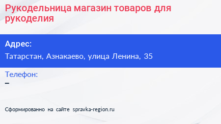 Рукодельница, магазин товаров для рукоделия по адресу Татарстан, Азнакаево, улица Ленина, 35 в дальнейшем Организация, размещена в следующих категориях: