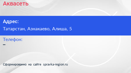 Аквасеть по адресу Татарстан, Азнакаево, Алиша, 5 в дальнейшем Организация, размещена в следующих категориях: