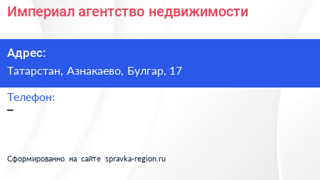 Империал, агентство недвижимости по адресу Татарстан, Азнакаево, Булгар, 17 в дальнейшем Организация, размещена в следующих категориях: