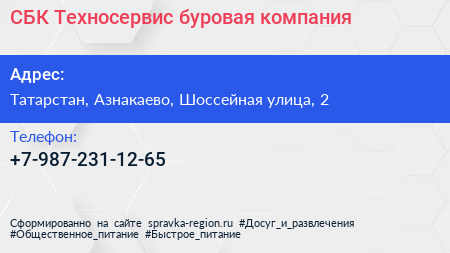 СБК-Техносервис, буровая компания по адресу Татарстан, Азнакаево, Шоссейная улица, 2 в дальнейшем Организация, размещена в следующих категориях: