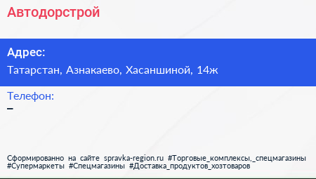 Автодорстрой по адресу Татарстан, Азнакаево, Хасаншиной, 14ж в дальнейшем Организация, размещена в следующих категориях: