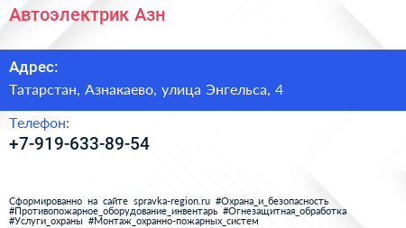 Автоэлектрик Азн по адресу Татарстан, Азнакаево, улица Энгельса, 4 в дальнейшем Организация, размещена в следующих категориях: